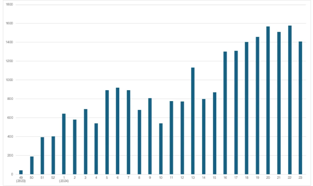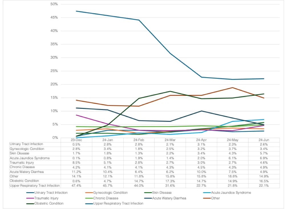 The number of patients who visited per epidemiological week steadily increased over the study period; from April 14th onward, over 1,200 consultations were made weekly (Figure 1). The five most common diagnostic categories were upper respiratory infection (URI), other diseases, obstetric conditions, acute watery diarrhea, and chronic diseases, which accounted for over 70% of all consultations (Figure 2). Over the study period, the proportion of URI cases gradually decreased, whereas the proportions of obstetric conditions, acute jaundice syndrome, and skin diseases increased (Figure 3).