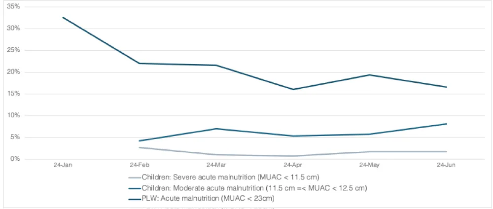 The proportion of children aged 6 months to 5 years with severe acute malnutrition (SAM) remained stable at 1% to 2%. However, the proportion of children with moderate acute malnutrition (MAM) increased slightly from 4.2% to 8.0% during the study period. Among PLWs, the proportion of patients with acute malnutrition showed a consistent decline, decreasing from approximately 32% to 16% (Figure 4).