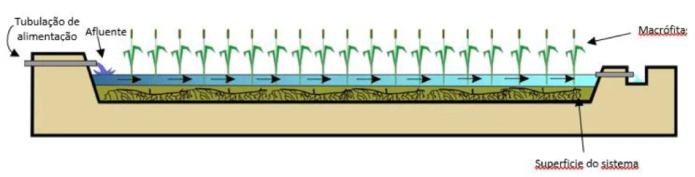Constructed Runoff Wetlands (WCS): When present, the support medium (substrate) remains saturated and with water flow flowing across the surface, that is, above the support material. WCS have favorable conditions for the development of several species of aquatic macrophytes, which can be floating, submerged or emergent. The effluent to be treated is distributed homogeneously on the surface of the bed, flows horizontally and superficially, with a water depth of around 0.5 m and low flow velocity. The treated effluent is collected by drainage pipes located at the bottom of the support material. It is noteworthy that this system operates with continuous effluent feeding [6] (Figure 3).