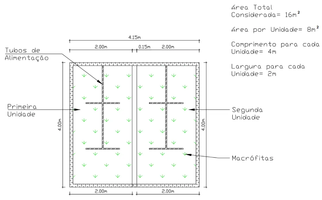 The total area of the system was 16 m2 for an average flow rate of 3 m3 / d. With two units in parallel, each with a surface area of 8 m2 (width of 2 m and length of 4 m) as illustrated in Figure 8. If there is a need to obtain a better quality effluent, it is possible to insert a post-treatment consisting of horizontal flow wetlands with landscape adaptation, with the same surface area of 8 m2 that will polish the treated water in the first 2 modules.