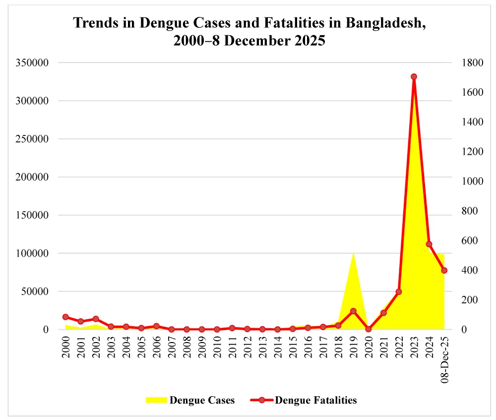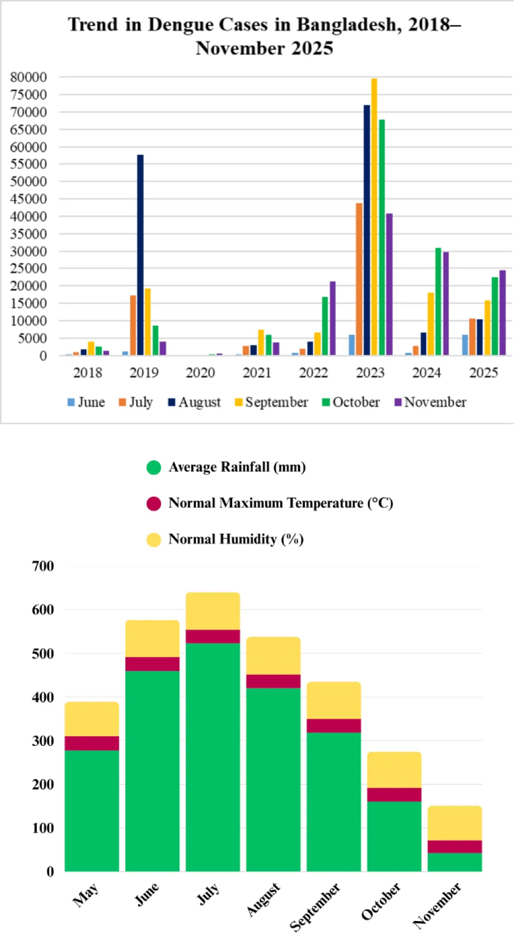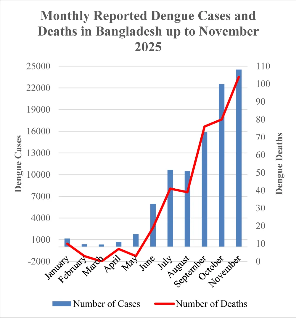 November 2025 brought the crisis to a new peak: on 18 November alone, over 900 viral fever patients flooded hospitals, joining nearly 3,000 dengue cases already under treatment [63]. Since 2023, more than half a million Bangladeshis have been infected, and over 2,670 have died—marking the deadliest dengue toll in the nation’s history. By the end of November, total cases had surpassed 94,300, hospitalizations had exceeded 92,000, and deaths had risen to 382. November alone recorded more than 24,500 cases and 104 fatalities, meaning that over one-quarter of the year’s infections and deaths occurred in a single, devastating month [62].