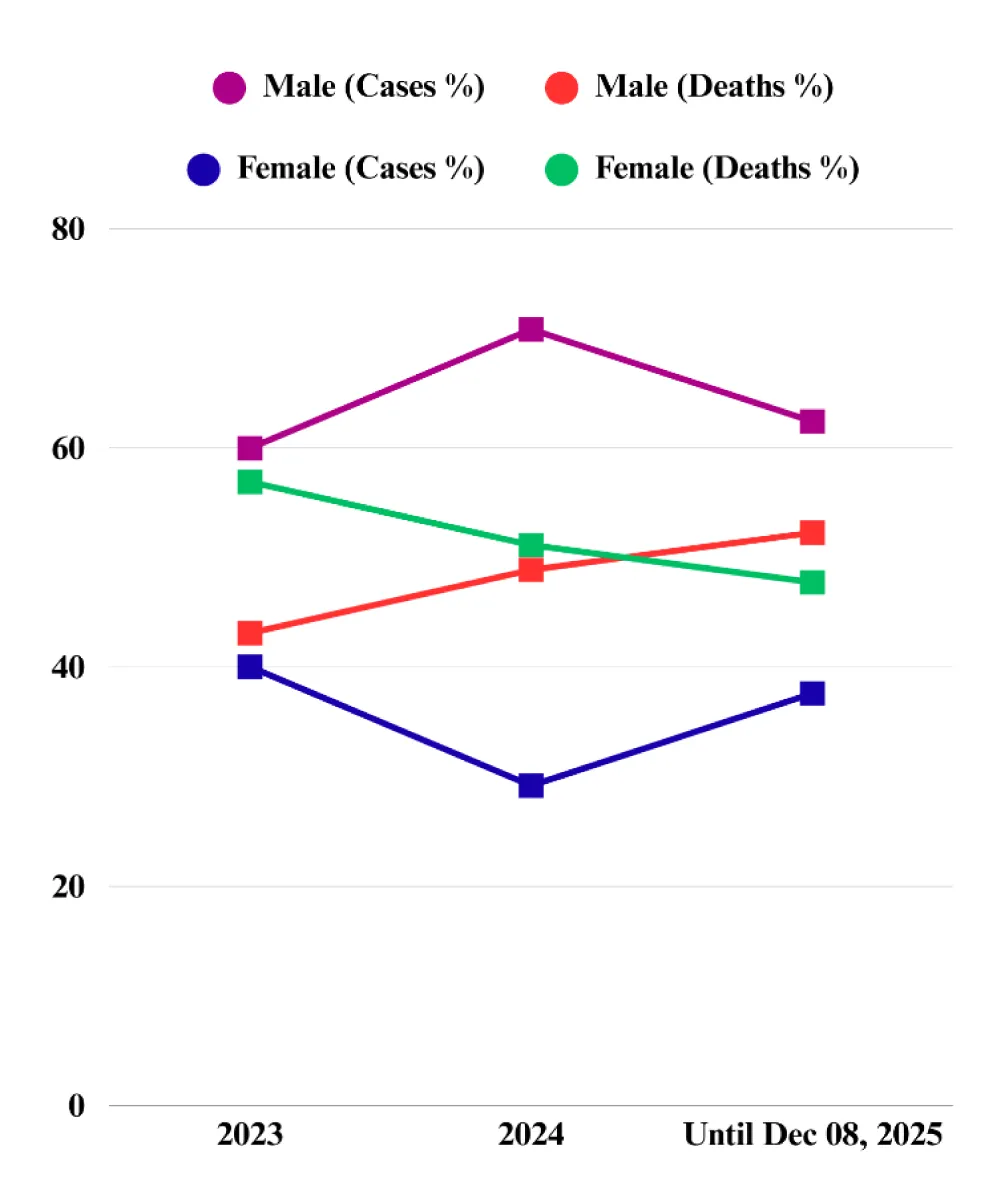 Historical data magnify the crisis. Between 2000 and 2022, Bangladesh recorded 853 dengue-related deaths [39,64], yet 2023 alone more than doubled that total, with 1,705 fatalities and over 321,000 infections—the largest annual outbreak on record (Figure 1). The demographic landscape is shifting. In 2023, women represented roughly 40% of dengue cases but accounted for 57% of deaths [65]. By December 8, 2025, men experienced nearly twice as many cases and over half of all deaths (Figure 4). Notably, in 2023, older adults faced disproportionately severe dengue and higher mortality due to immune vulnerability and comorbidities, with each additional decade raising fatality by 30%, whereas by 2025, young adults aged 21–30 accounted for over a quarter of both cases and deaths [62,65]. However, older adolescents and young adults also represented more than half of all cases during the 2016, 2018, and 2019 outbreaks [65].