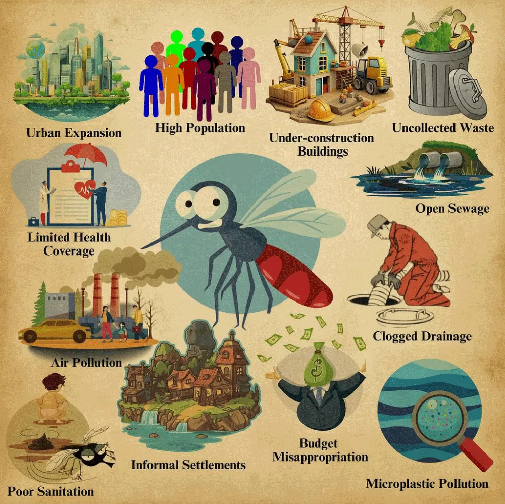 The recent dengue outbreaks, fueled by changing climate patterns, rapid urbanization, high population density, insecticide resistance, and low public awareness, have placed a severe strain on Bangladesh’s healthcare system and economy. While climate change and urban growth are widely acknowledged as major drivers of the rising dengue burden, several less-discussed factors—often tied to uncontrolled urbanization—have intensified the crisis; these interconnected issues, highlighted in recent international research and media, remain largely overlooked by the public due to limited awareness.