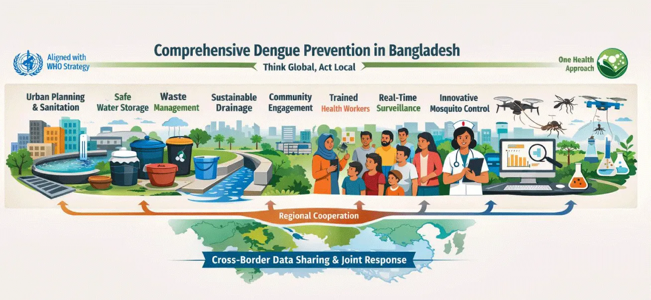 Aligned with WHO policy and reflecting the 'think global, act local' approach, addressing Bangladesh’s dengue surge requires moving away from reactive, chemical-heavy measures toward a One Health–based Integrated Vector Management (IVM) strategy, which incorporates public health safeguards into urban planning, water storage, sanitation, waste management, drainage, and environmental governance. Strengthening surveillance-led action, evidence-based budgeting, trained frontline health workers, sustained risk communication, and community participation is essential to move from crisis response to prevention, particularly in densely populated and climate-vulnerable urban settings. Given shared climatic risks and population mobility, scientific innovation and cross-border collaboration are critical to ensuring sustainable, regionally coordinated dengue control in Bangladesh.
